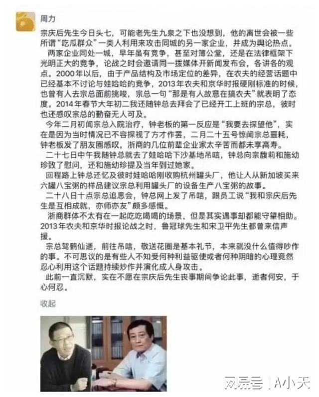 針對此次輿情事件,3月3日鐘睒睒在上述發(fā)文中澄清了以下幾點(diǎn):首先是宗老逝世后,他曾去靈堂叩拜吊唁;另外他也澄清其第一筆創(chuàng)業(yè)收入并非來自于娃哈哈;也從未在娃哈哈領(lǐng)薪,所以也談不上當(dāng)年因?yàn)闆_貨被開除;而當(dāng)年娃哈哈與農(nóng)夫山泉作為主角的“純凈水與天然水之戰(zhàn)”,雖然雙方互有訴訟,但兩人最終也在杭州市主要領(lǐng)導(dǎo)的見證下握手言和。最后他在文末表示,“希望廣大網(wǎng)友們表達(dá)對宗老追思的同時(shí),勿被個(gè)別自媒體或大V帶了節(jié)奏,無論娃哈哈或農(nóng)夫山泉,始終都堅(jiān)持為老百姓生產(chǎn)好的產(chǎn)品?!?/p>