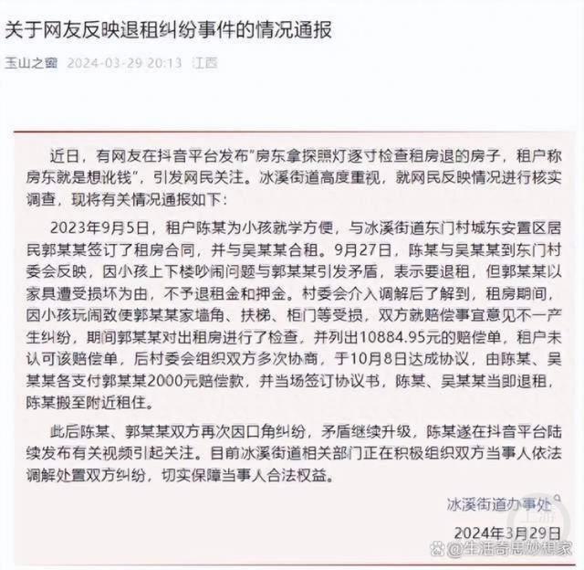當(dāng)?shù)亟值擂k3月29日通報中稱,2023年9月,陳某(當(dāng)事人陳女士)到東門村委會反映,因小孩上下樓吵鬧問題,與房東郭某某引發(fā)矛盾,表示要退租,但郭某某以家具遭受損壞為由,不予退租金和押金。