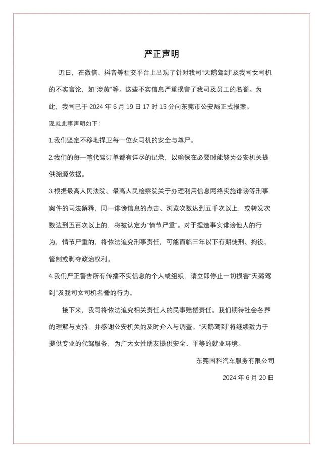 據(jù)網(wǎng)友爆料,東莞天鵝代駕平臺(tái)被指涉嫌提供“特殊服務(wù)”,一時(shí)間輿論嘩然。不少網(wǎng)友紛紛表示震驚和不解,認(rèn)為這是對(duì)女性代駕司機(jī)的一種污蔑和歧視。面對(duì)輿論的質(zhì)疑,天鵝代駕平臺(tái)迅速作出回應(yīng),堅(jiān)稱(chēng)此消息純屬謠言,并已向警方報(bào)案。