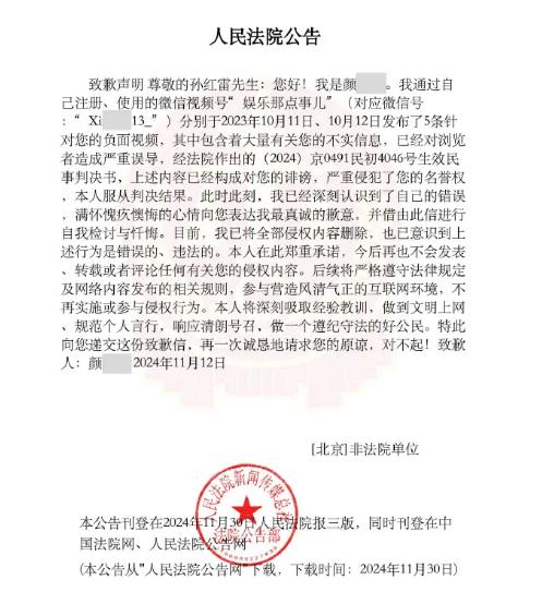 法院最后判決,顏某得在微信視頻號(hào)上公開向?qū)O紅雷道歉,還得賠償孫紅雷精神損失費(fèi)和維權(quán)的費(fèi)用,一共5萬元人民幣。顏某已經(jīng)賠了錢,還在媒體上公開向?qū)O紅雷道了歉。
