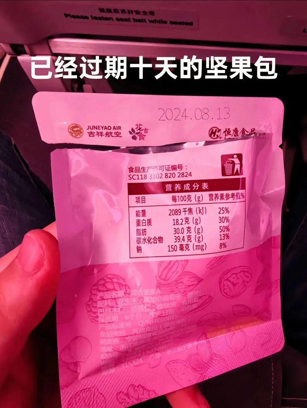 據(jù)乘客提供的信息,堅果零食包裝上標注的生產(chǎn)日期為2024年8月13日,保質(zhì)期為6個月。然而,在航班上發(fā)放時,該零食包已經(jīng)超過保質(zhì)期10天。